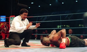 Michael Bentt is beaten by the count as he loses his world title to Herbie Hide in London in 1994. Photograph: John Gichigi/Getty Images