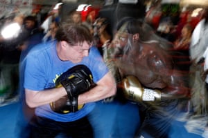 Deas spends one three-minute round on the mitts with his 6ft 7in pupil, then a second, before calling on another member of the coaching team for relief and descending from the apron drenched in sweat. He then peels off the mitts to show a dark-blue tracery of veins bulging through the pale skin along the insides of his forearms like something from a Cronenberg movie.